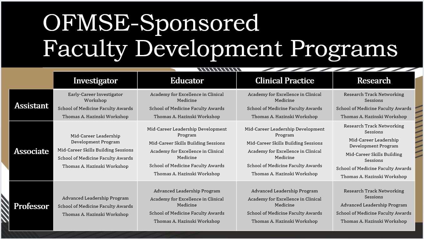 The Mid-Career Skills Building Sessions are designed to engage associate professor-level faculty on all tracks in learning core competencies necessary for effective department and/or section/division leadership. The didactic and colloquial sessions provide practical examples and applications of the core competencies necessary to be successful and thrive on this track with the goal of career advancement and promotion to full professor. Mid-career faculty are invited to attend all sessions or only those of interest to them.